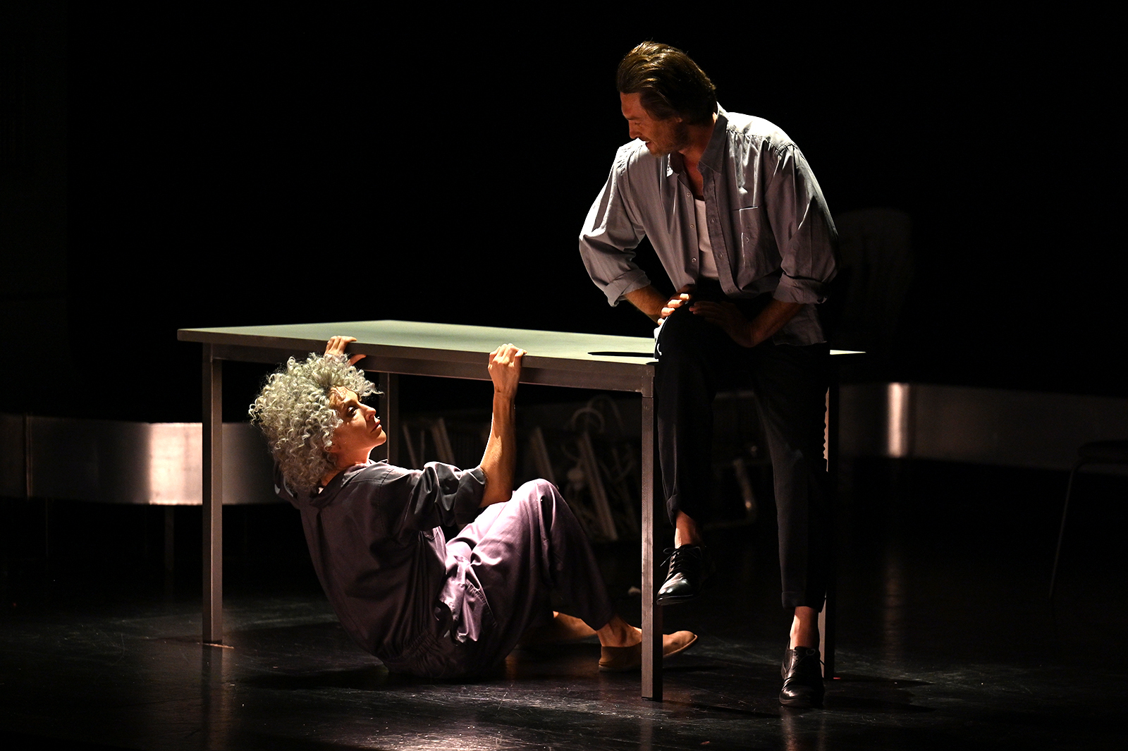 Эту постановку сделали несколько замечательных женщин — над исходным материалом Степновой и Смирновой на площадке работала драматург Ольга Федянина, а мрачное и стильное пространство было придумано и продумано художником-сценографом Ксенией Перетрухиной. Но главных героинь, если так можно выразиться, у этой премьеры две.